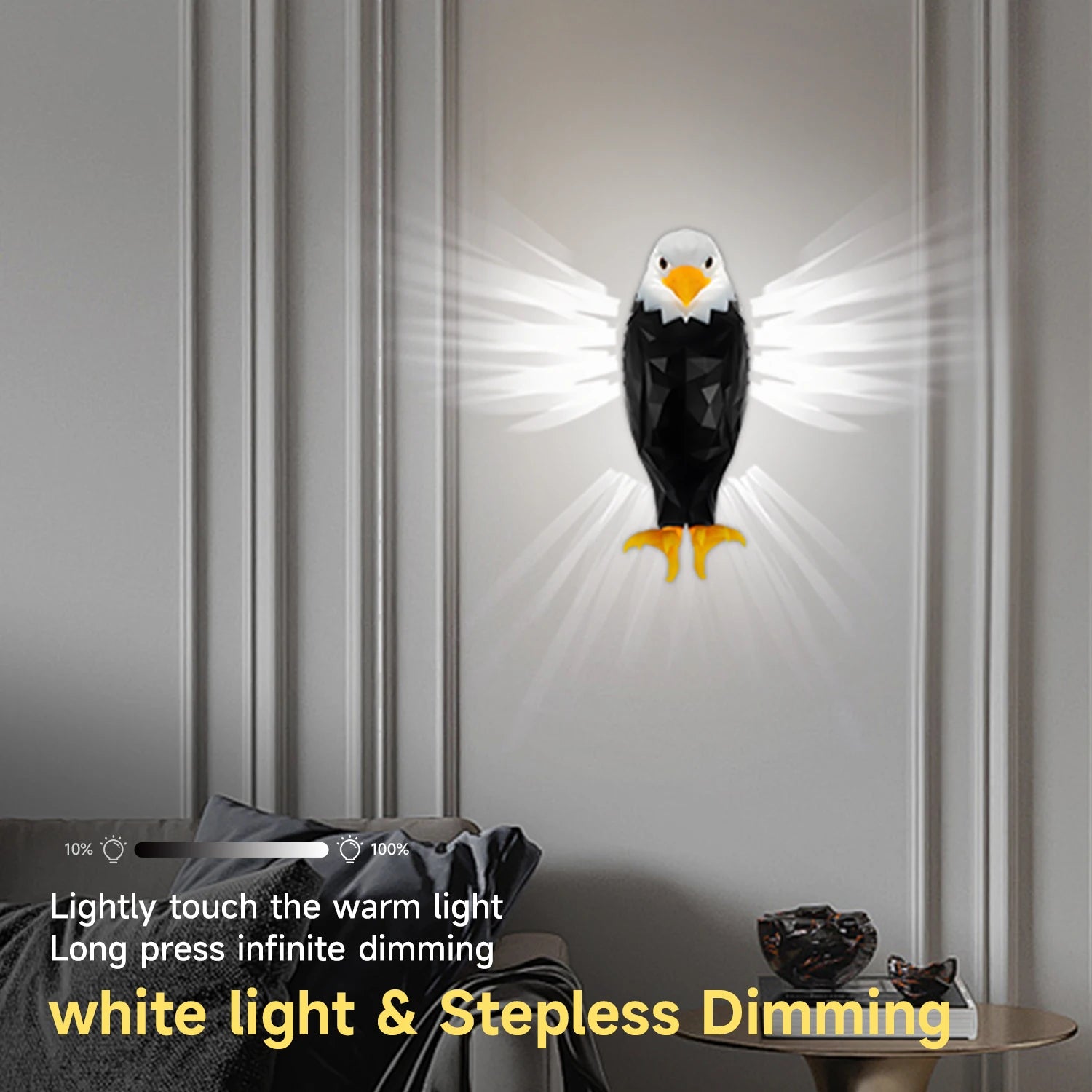 How do I control the brightness of the Eagle Wall Lamp?You can seamlessly adjust the brightness levels with a simple touch, thanks to the advanced touch control feature.