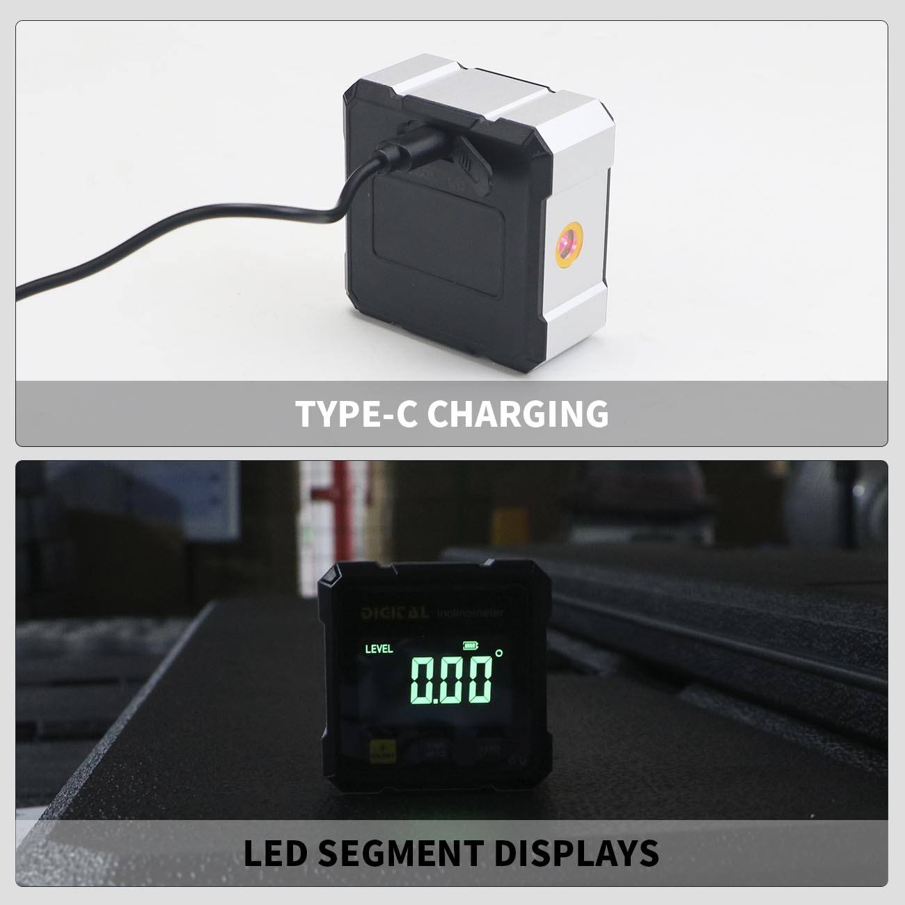 Equipped with a rechargeable battery, this inclinometer offers convenient, long-lasting operation without the need for frequent battery replacements. Its dual-sided digital display ensures you can read measurements from different angles, improving usability and efficiency on the job. The laser function enhances accuracy and allows quick alignment with reference lines or surfaces, making your work faster and more precise.